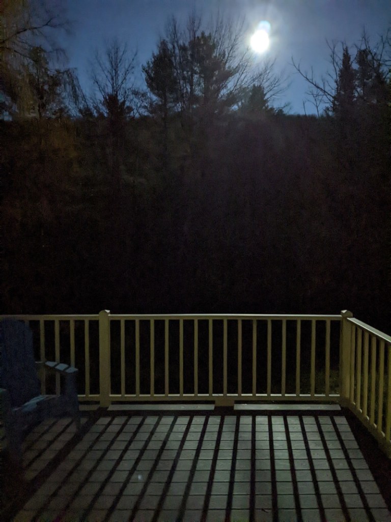 Well, of course. And they will be anyway, in spite of me or anyone else, though I may pile words on them in an effort to wrest them into something for my purposes. “Moon go away I don’t love you no more” writes Jim Simmerman in a poem and collection with the same title. I’ve known days like that, and so have you. But the sheer regularity of full moon, full moon, full moon invites me to linger under the magic sky, wordlessly, or singing a tune I don’t realize I’m humming under my breath.