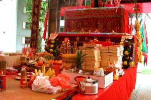 An altar is an important element of very many spiritualities around the world. It gives a structure to space, and orients the practitioner, the worshipper, the participant (and any observers) to objects, symbols and energies. It’s a spiritual signpost, a landmark for identifying and entering sacred space. It accomplishes this without words, simply by existing. The red color of the Taoist altar below immediately alerts the eye to its importance and energy.