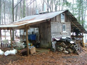 Sugar shacks smoke trough the night as the sap rises and the “sweet trees” yield their juice. You pass what you think is just a stand of trees, and there’s a faint square glow from a shack window, someone patiently (or impatiently) at work through the evening. Boil down the sap over a low heat, a wood fire as often as not, more and still more, then just keep going beyond all reason, and you eventually get a single lovely brown gallon for every thirty to forty of pale sap you’ve lugged in. If you do sugaring for more than yourself and family and maybe a few friends, you upgrade and invest in an evaporator. And if through the hours and days you manage not to scorch the slowly condensing syrup, that first taste on pancakes (or over a bowl of crisp new snow, a northern treat more rare this year) makes sore muscles and bloodshot eyes and smoky clothing worth it.