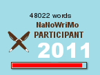 “Not a problem for you — after all, you maintain this blog, right?” you say. Try 1667 words a day of fiction for a month. Not such an impossibility– serious writers often set something like that as their daily word limit every day of their writing lives. Never done something like it? It can firm your resolve or leave you in the dust. I’ve been in both places. “So how ya doin’ so far?” you ask. Well, everybody starts small. That’s an hour’s work. Onto the rest of the month!