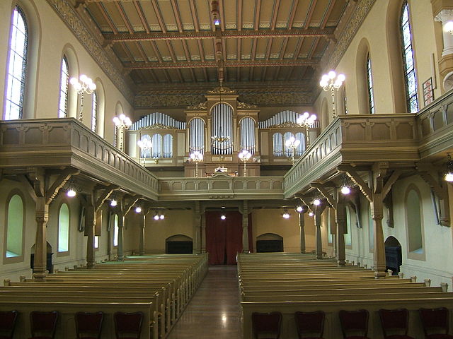 Interior of a Protestant church, looking from the altar toward the rear entrance.