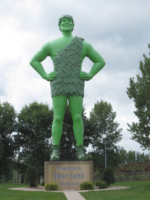 To celebrate the 1978 completion of interstate I-90 as a highway linking Boston to Seattle, Green Giant Foods erected this statue of their Jolly Green Giant mascot in Blue Earth, Minnesota. (Green Man always manages to sneak his way into consciousness, one way or the other.)