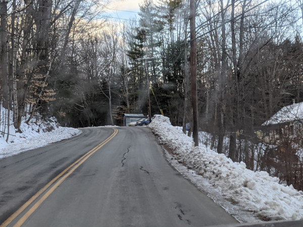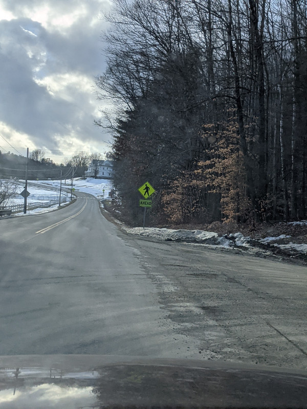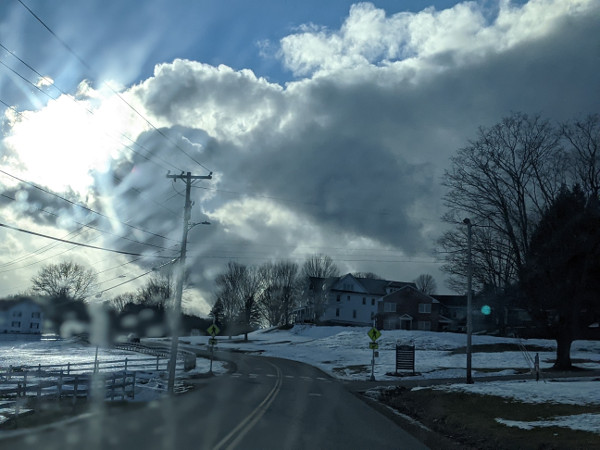 Sometimes my sight may be blurred — to the left the car windshield has streaks of pine-pitch I haven’t totally cleaned off — and other things may claim more of my attention at the outset. Here a dramatic winter sky dominates my visual field.
