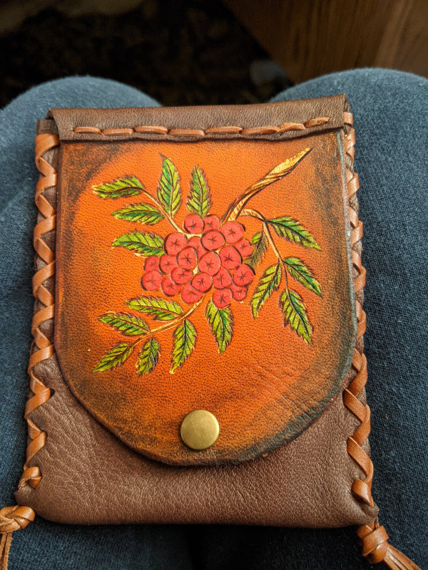 My go-to magical tree, our front-yard guardian Rowan, already has reddening berries, though the overcast sky dulls their hues. And as if to announce the season, I recently received from New Hampshire Druid friends a lovely personalized gift of a leather offering-pouch, crafted by AODA archdruid Dana Driscoll, featuring “my” Rowan in full red-berry mode. The Rowan dons its spring-in-autumn guise, having something to say in all its seasons, whether or not I’m listening.
