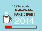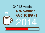 Reporting in from the depths of Nano-ing. My goal is 25K by this Saturday, the halfway mark, and I’m obviously behind, though not impossibly so. Woo-hoo!