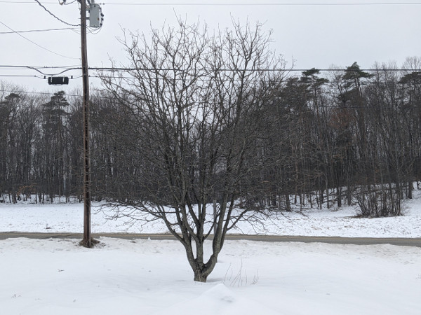 Rowan, as an image of winter’s inwardness, you do well. Hard even to make out completely, set as you are against a background of other trees. Barren, and with the camera’s foreshortening, looking like you sit directly under electrical lines.