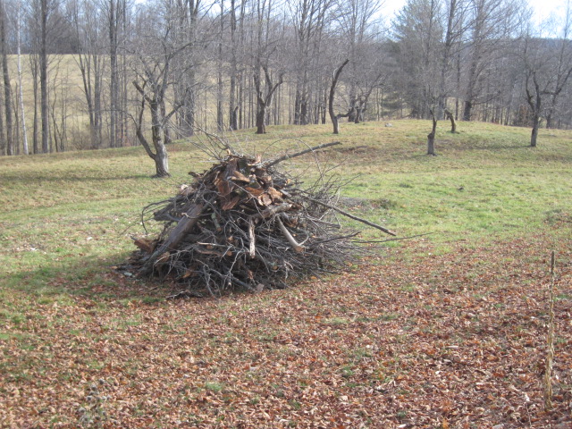 Yes, this is a pile of sticks and small branches in an old orchard and pasture near where I live. You can see the long shadows of the tree-trunks — it’s late afternoon in November, a week ago. The owner cut a dying tree from the treeline that stands to the left, outside the picture. He’s already chopped, split and picked up the firewood, and gathered the remainder here.