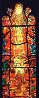 The image is of a stained glass window “by Tom Denny, reflecting the thinking of Traherne, in Audley Chapel, off Lady Chapel, Hereford Cathedral, dedicated in March 2007.”