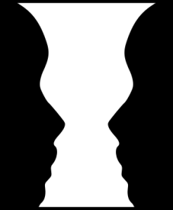 The will involved in magic is much better identified as intentionality, and it’s intentionality that helps our New Year’s resolutions actually succeed. Greer continues: “Real will is effortless. It corresponds, not to struggle and strain, but to what philosophers call ‘intentionality,’ the orientation of the mind that locates meaning in objects of experience” (20). He gives the example of choosing to look at a window, or through a window at something on the other side. The well-known image of faces or a vase offers a similar instance. It’s by intention that we shift our perception. Strain has nothing to do with it. You perceive the two dark faces in profile looking at each other, or you perceive a white vase on a black background. It’s hard to see both simultaneously. But intentionality lets you shift between them. It’s a choice.