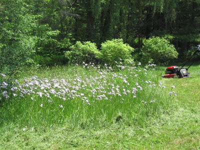 Most of our yard is the typical rural patch of grass, which given half a chance will turn to sumac, crabgrass, chicory, dandelions and even slender saplings inside six months. In the few years that we’ve owned the house, we’ve let whole quadrants go uncut for a season. Sometimes it’s from pure practical laziness — we’ve no one to impress, after all, and no condo association to yelp at us — and it saves gas and time, until we get around to putting in more of the permanent plantings that won’t require cutting. Until then, we’re getting the lay of the land, seeing how soil and drainage and sun all work together (our three blueberry bushes, visible in the background in the second photo, thrive on the edge of our septic leachfield), and which local species lay claim first when we give them a chance to grow and spread. The moles that love our damp soil also tunnel madly when we leave off mowing for the summer. We think of it as natural aeration for the earth.