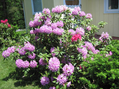 Here are Yin and Yang, our two rhododendrons — a single red flower grows on the pink bush in the foreground, with a branch of the red bush showing in the background. Plant envy? Unfortunately the red bush doesn’t have a single pink flower, or the image would be complete. In a month they’ll be back to their usually ungainly woody scraggly selves, with no hint of the glory they present each May. Is the aftermath the only time we appreciate what we had — when it’s finally gone?