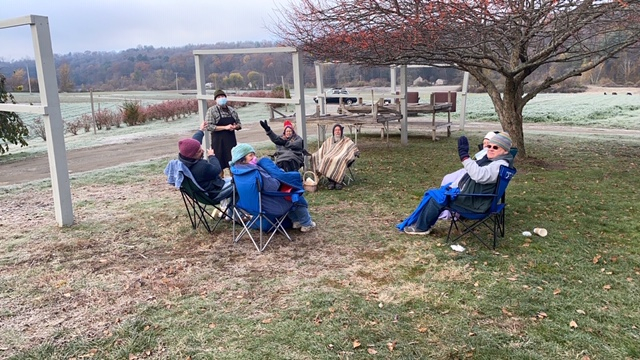 front yard by moonlight at 3:30 am this morningThe Breakfast Six celebrating the last day of the season at our favorite spot. Sharing is the most human, communal and Samhain-y thing we do. Chef Michael is standing, masked. I’m in lavender hat on far left.